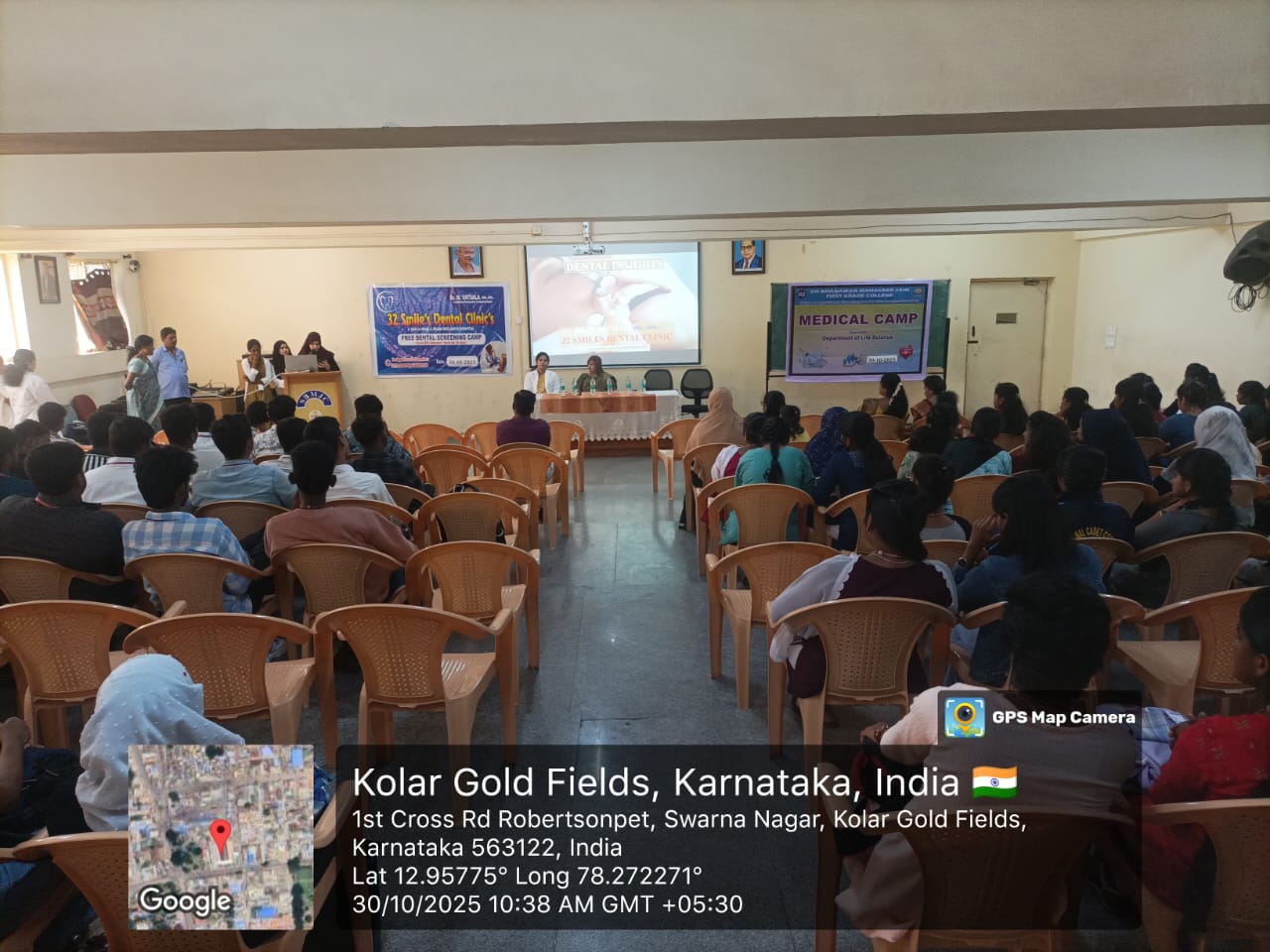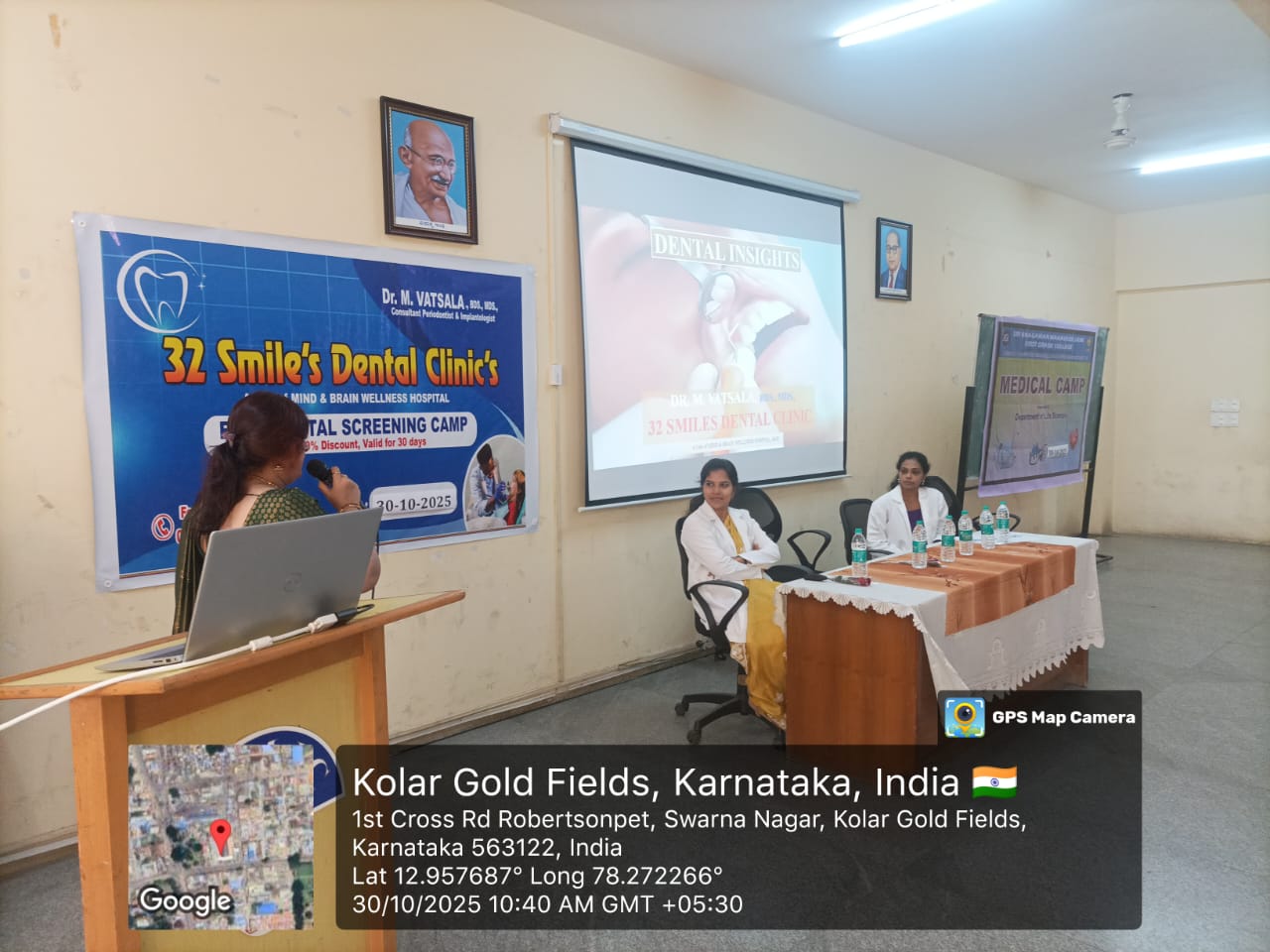 A team of Dr.Vatsala and Dr.Lydia from 32 smiles Dental Clinic, KGF delivered the lecture on regular dental examination, importance of Oral hygiene counselling, correct brushing techniques and gum infections. Special attention was given to educating students, faculty members and public about preventive measures, balanced diets, and the ill effects of tobacco and sugary foods on dental health. The team also done basic screening of oral hygiene for students, staff members and public .
