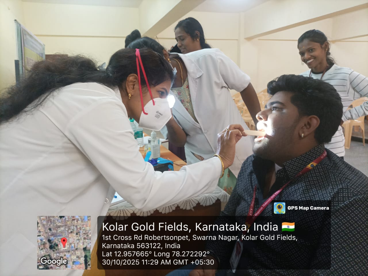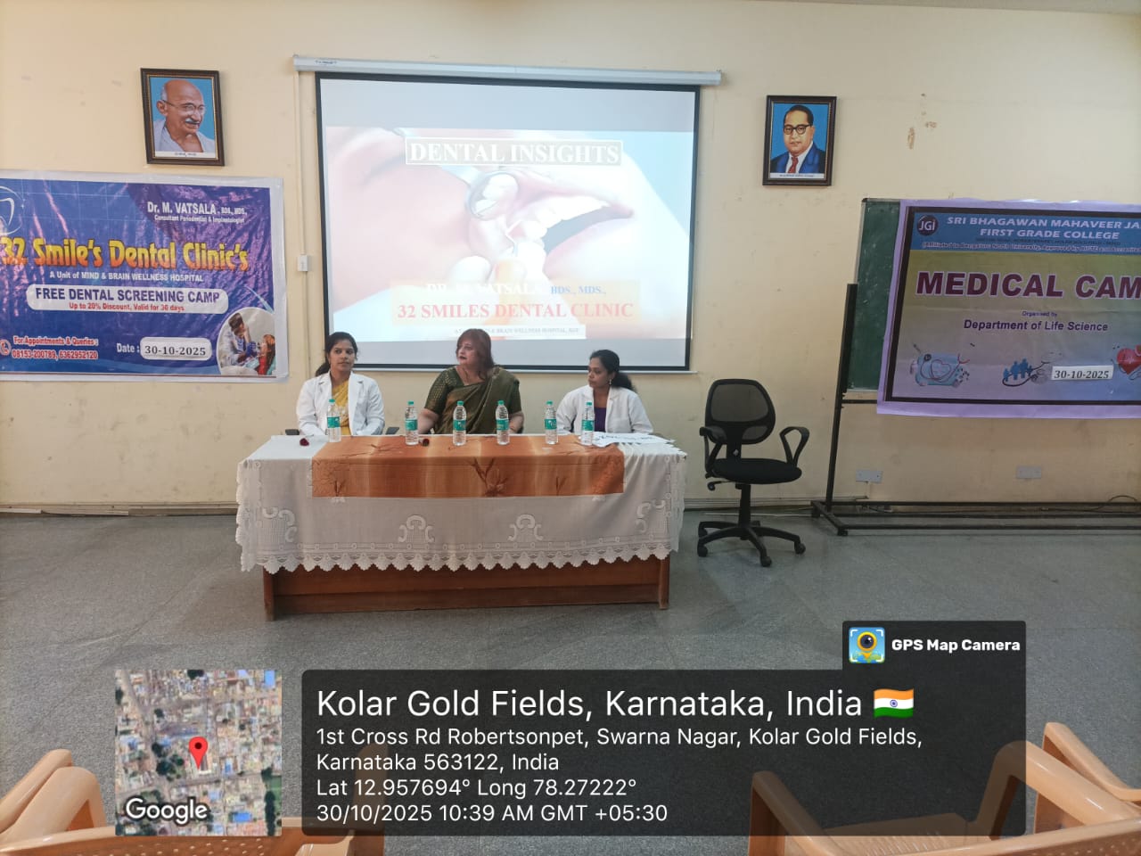 The Department of Life Science organized a Dental Check-up Camp at Sri Bhagawan Mahaveer Jain First Grade College,KGF in association with 32 smiles Dental Clinic,KGF on 30th October 2025 with the objective of promoting oral health awareness and providing free dental consultation to students , staff and Public. The camp aimed to educate participants about the importance of maintaining proper oral hygiene and to identify common dental problems at an early stage.