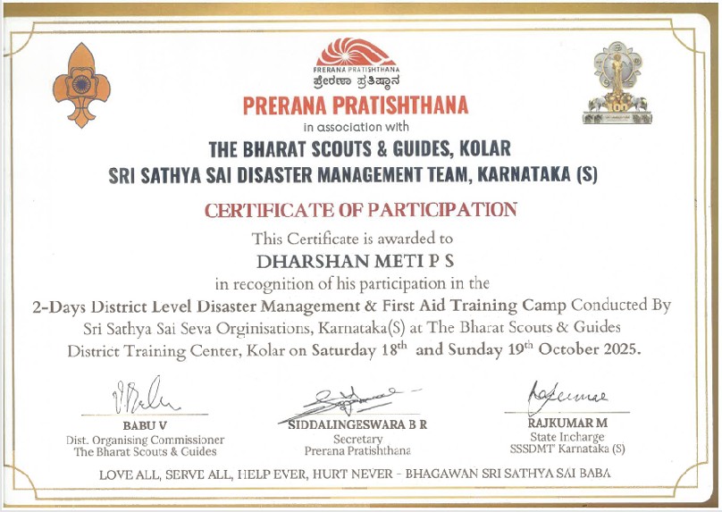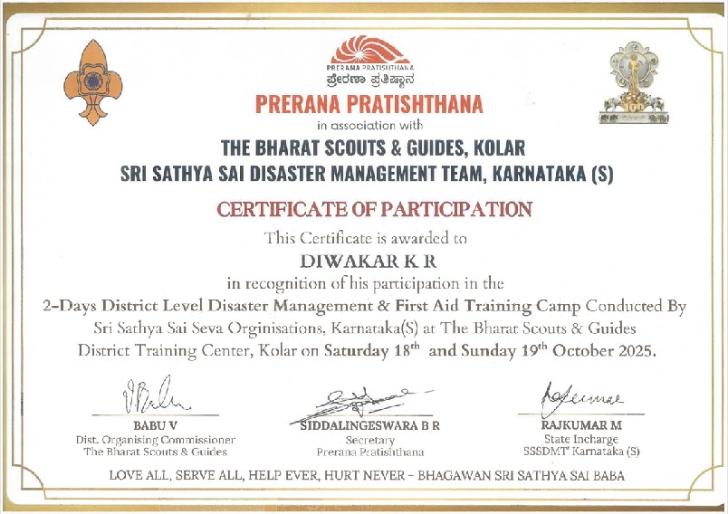 The Bharat Scouts and Guides, kolar in association with Sri Sathya Sai Disaster Management Team, Karnataka organized 2 days District level Disaster Management and First aid training camp at kolar on 18th and 19th October 2025.