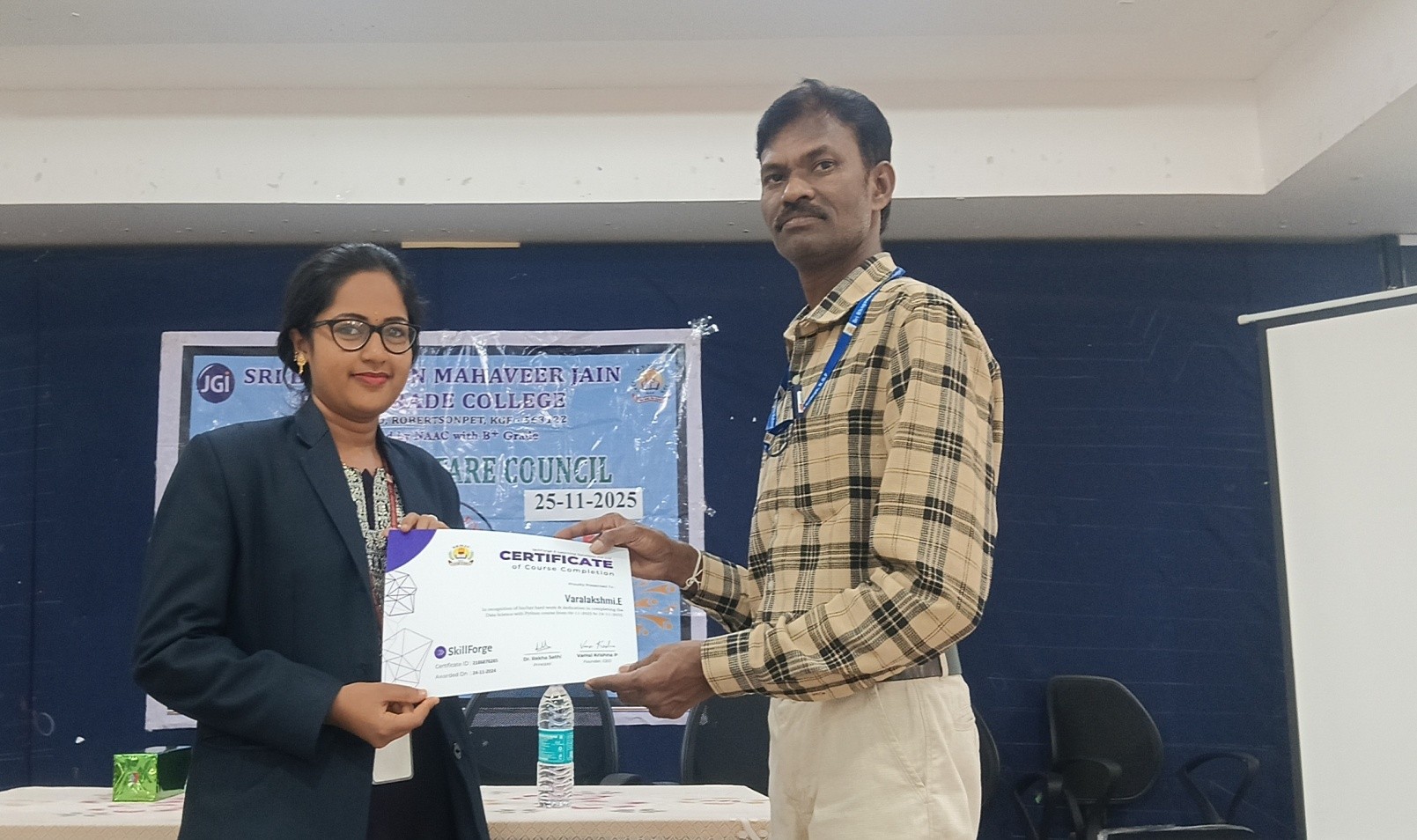 The Student Welfare Council (SWC) organized the “SkillForge Certification Day” on Tuesday, 25 November 2025, from 10:30 AM to 11:30 AM in the Conference Hall to recognize the achievements of final-year students who successfully completed industry-oriented skill development courses. The event was coordinated by Mr. Praveen N, SWC Officer, and Mr. Changareddy, SWC Coordinator, and was graced by the presence of resource persons Mr. Vamsi Krishna P, Founder & CEO of SkillForge, and Ms. Silpa DV, Co-Founder & COO of SkillForge, along with HODs and faculty members from various departments.