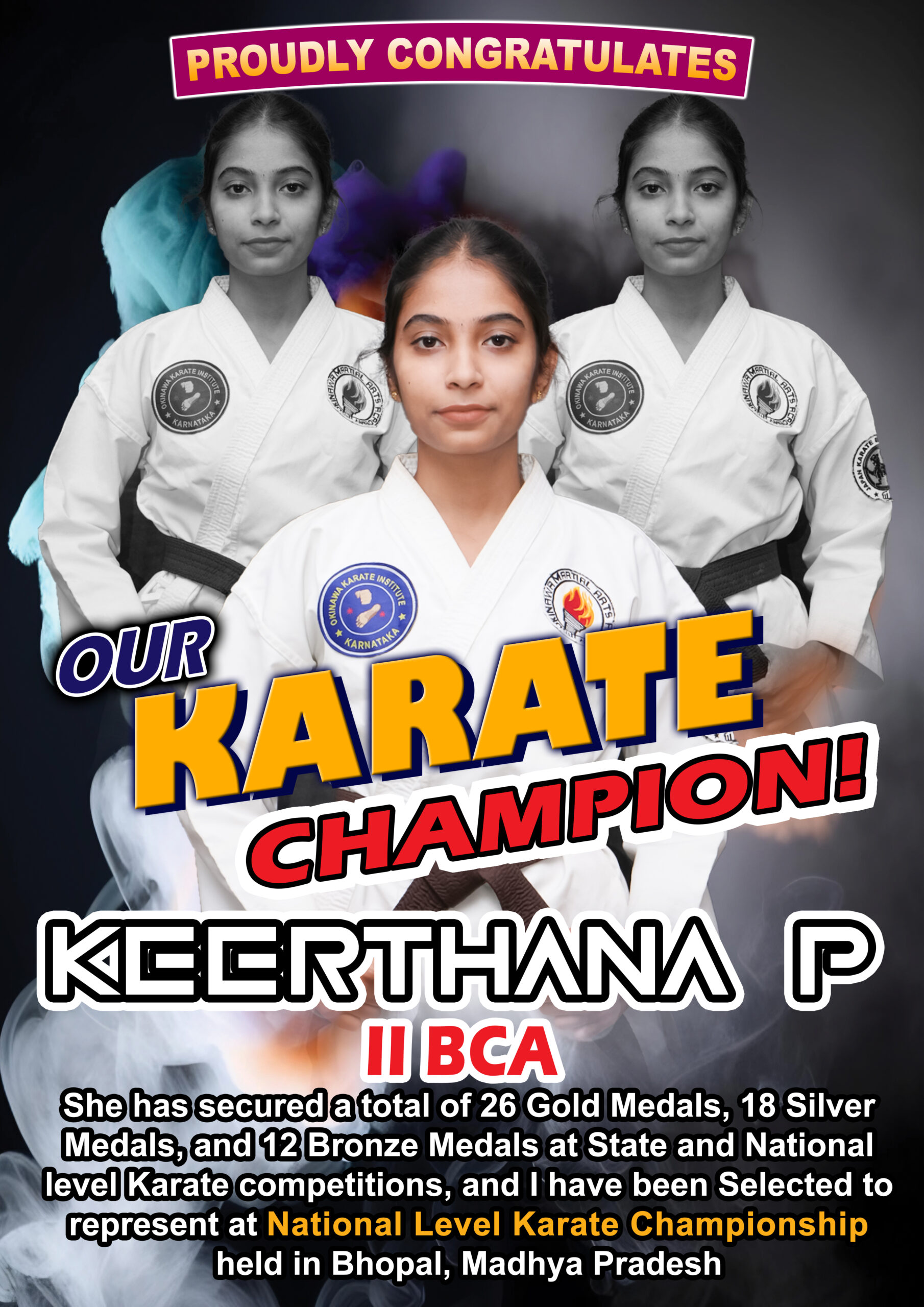 Keerthana P, II BCA, has achieved remarkable success in Karate by securing a total of 26 Gold Medals, 18 Silver Medals, and 12 Bronze Medals at various State and National Level Karate Competitions. She has also been selected to represent at the National Level Karate Championship held in Bhopal, Madhya Pradesh, showcasing outstanding talent, dedication, and sportsmanship