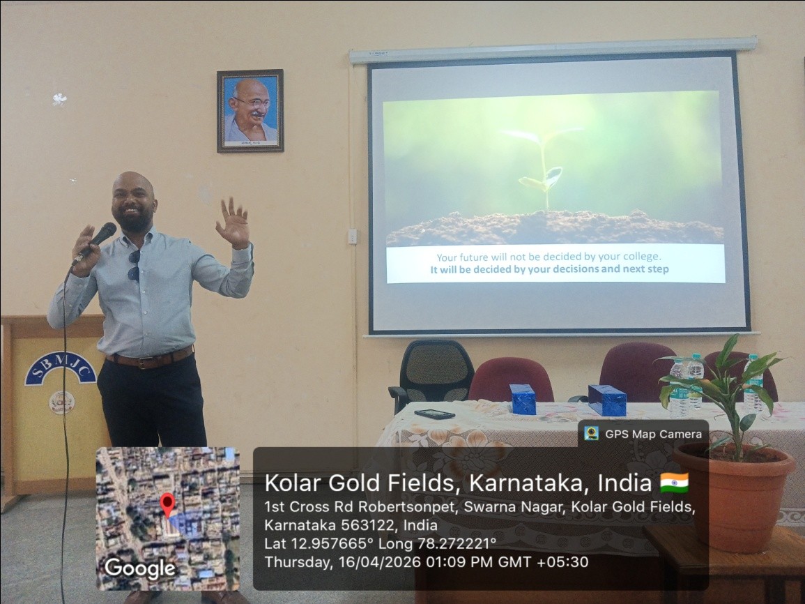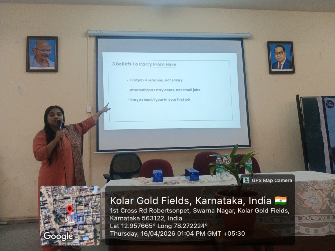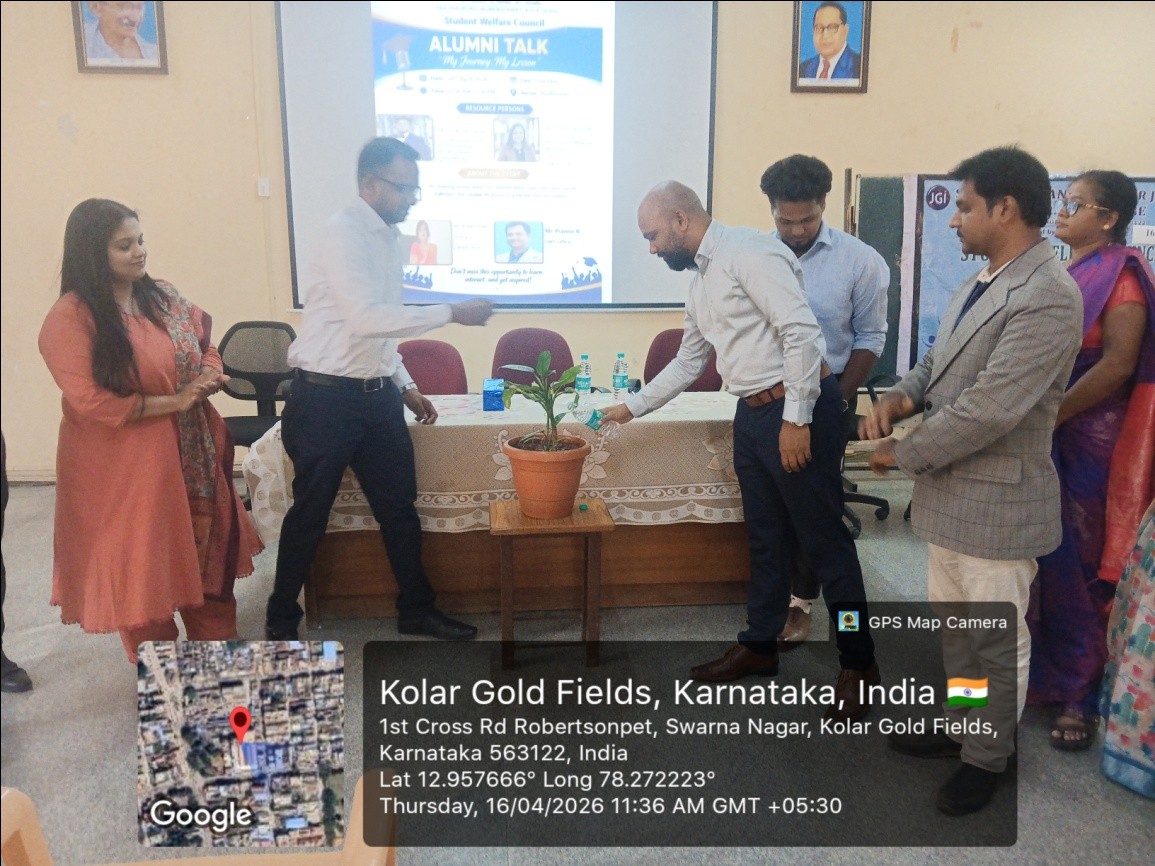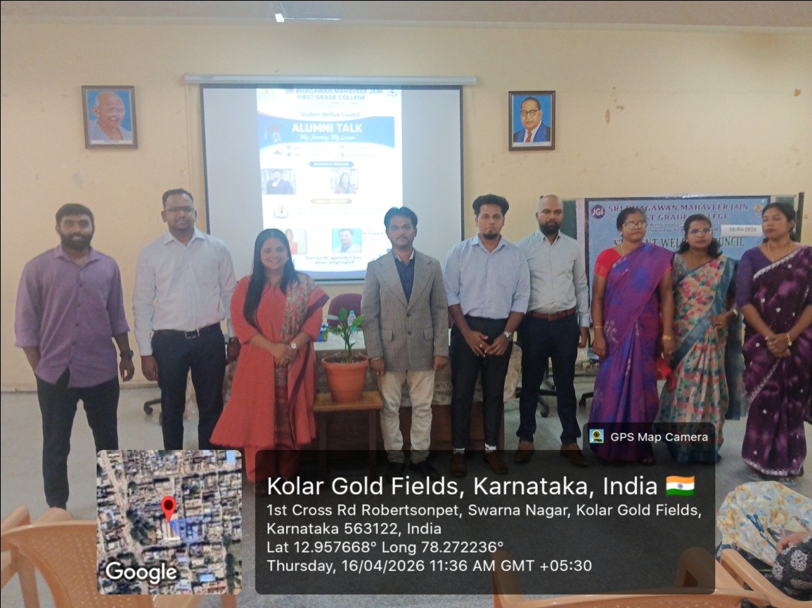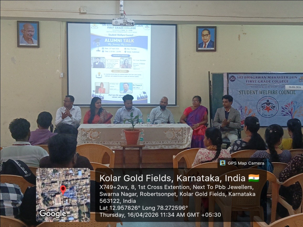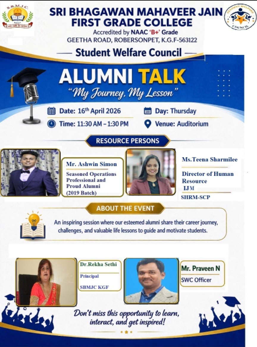 The Student Welfare Council of Sri Bhagawan Mahaveer Jain First Grade College, under the guidance of our respected Principal, Dr. Rekha Sethi, organised An Alumni Talk titled “My Journey, My Lesson” was successfully organized with the objective of bridging the gap between academic learning and corporate expectations. The session aimed to provide students with practical insights into career development, industry readiness, and personal growth through the experiences of distinguished alumni.
